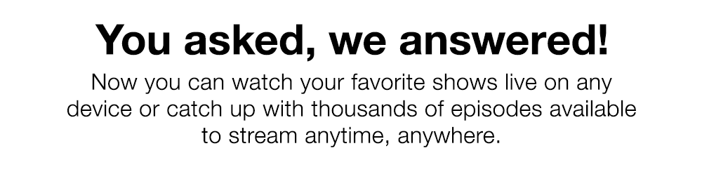 | You have access to full seasons, episodes and early premieres of your favorite shows | | | At Discovery Communications, we value your privacy. If you would like to update your email preferences or unsubscribe, please click here. Our mailing address is: Discovery Communications, LLC One Discovery Place Silver Spring, MD 20910